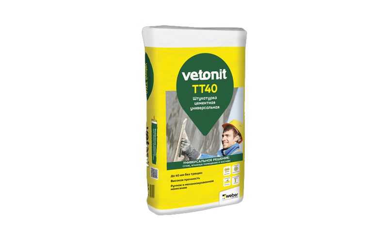 weber.vetonit TT40 - универсальная цементная штукатурка. Подходит для оштукатуривания фасадов, для предварительного выравнивания и ремонта стен и потолков в сухих, влажных и мокрых помещениях перед дальнейшим шпаклеванием, перед облицовкой керамической плиткой. Применяется по основаниям из бетона, кирпича, керамзитобетонных блоков, цементных штукатурок. Обладает повышенной влагостойкостью, высокой прочностью, трещиностойкостью, морозостойкостью. Для внутренних и наружных работ. Наносится ручным и машинным способом.