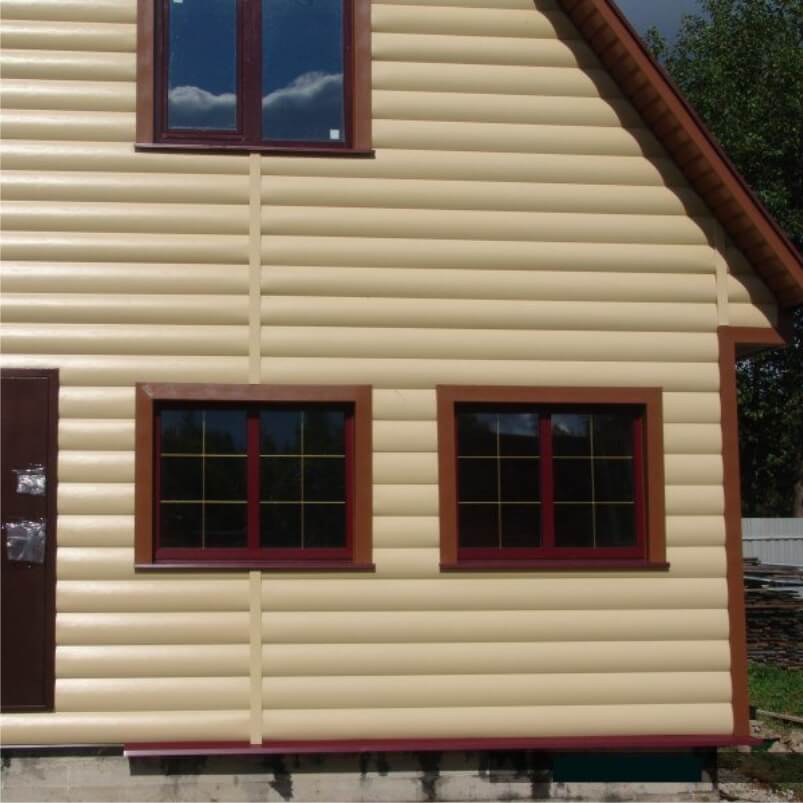 • В отличие от облицовки фасада деревом, сайдинг под бревно металлический «Блок-хаус GL» прост в монтаже и не требует дополнительного послемонтажного ухода.